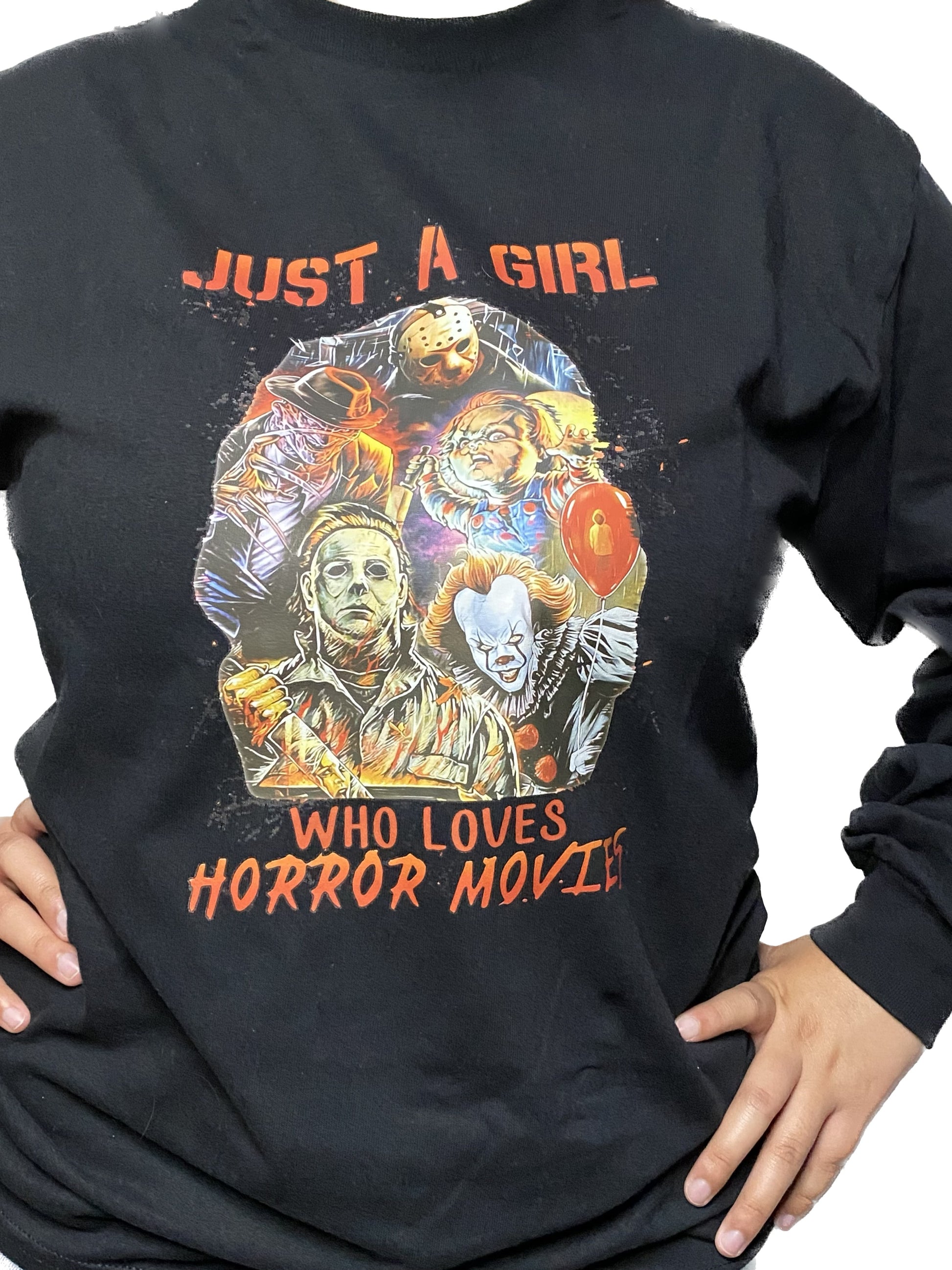 This Just a Girl long sleeved crew neck is more than just a fashion statement. Designed in sleek black, it's perfect for anyone who loves horror movies - because let's face it, just because you're a girl doesn't mean you can't handle a good scare!