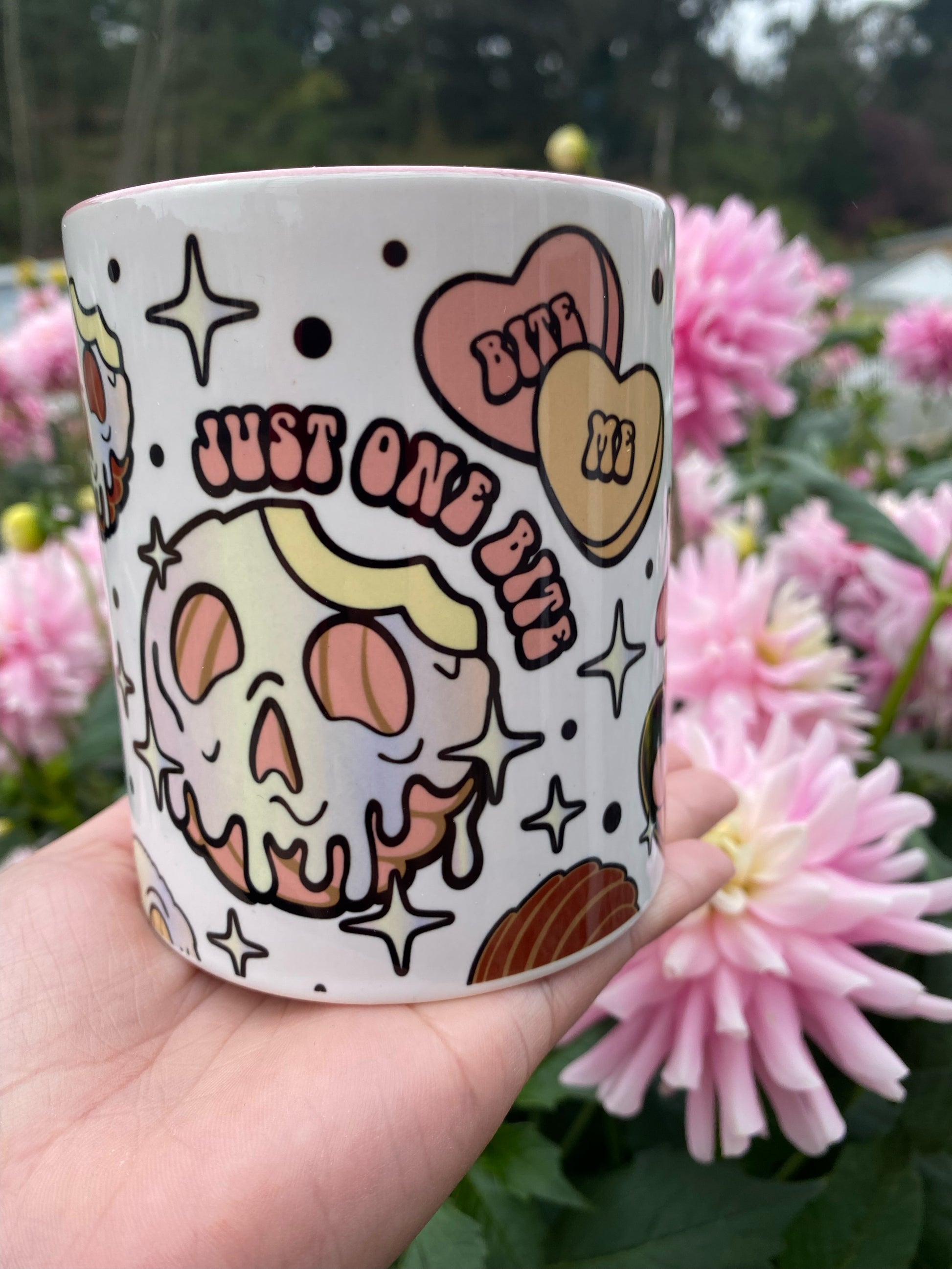 Be the fairest of them all with our Just One Bite mug! Enjoy your favorite beverage from this 11oz mug, featuring poisoned apples, and conchas with a pink handle. It's the perfect way to step into the spotlight!